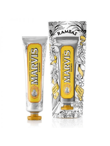 Η οδοντόκρεμα Rambas της Marvis είναι πλούσιες γεύσεις εμπνευσμένες από τροπικά νησιά. Τα ώριμα ροδάκινα συναντούν τον γλυκό ανανά και μια νότα μάνγκο που αιχμαλωτίζουν τις αισθήσεις. Η μέντα παρέχει φρέσκια αναπνοή που διαρκεί όλη την ημέρα.