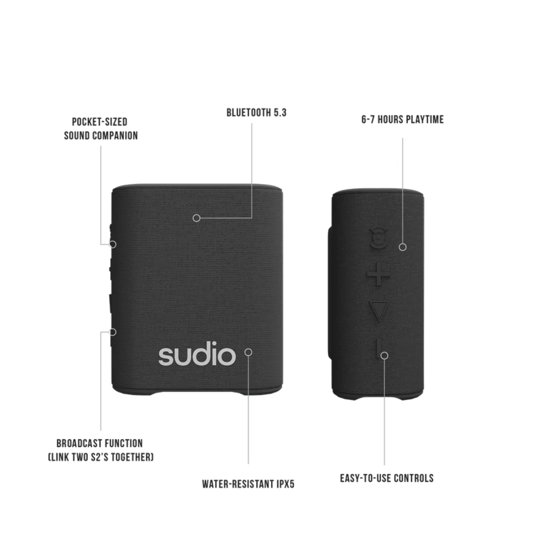 Το Sudio S2 είναι ένα μικρό σε μέγεθος αλλά ισχυρό στην απόδοση ηχείο, σχεδιασμένο για να σε συνοδεύει όπου κι αν πας. Προσφέρει δυνατό ήχο, είναι ανθεκτικό στις πιτσιλιές και ιδανικό για εξωτερικούς χώρους, ταξίδια ή απλές στιγμές απόλαυσης μουσικής.